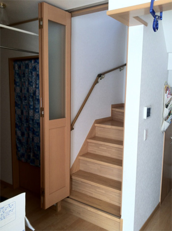 階段の入口にアズウッドペアパネルタイプで間仕切りさせて頂きました。