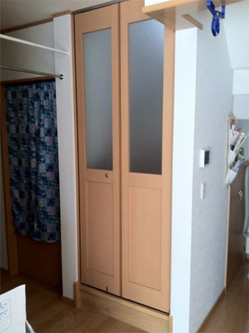 階段の入口にアズウッドペアパネルタイプで間仕切りさせて頂きました。 畳むタイプなので使用しない時は、今まで通りフルオープンで使用出来ます。 これからの寒くなる季節には2Fから冷気を遮断することが出来ます。